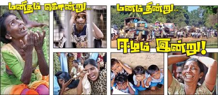 உயிர் கொஞ்சம் ஒட்டிக்கொண்டு இருக்கிறது என்பதைத் தவிர, சொல்லிக்கொள்ள எதுவுமே இல்லை. ”81 ஆயிரம் குடும்பங்களைச் சேர்ந்த 3 லட்சத்து 30 ஆயிரம் பேர் இங்கு இருக்கிறார்கள்’ என்று புள்ளிவிவரம் சொல்கிறார், முல்லைத் தீவு மாவட்ட மேலதிக அரசாங்க அதிபர் கே.பார்த்தீபன். மாத்தளன் கடற்கரைப் பகுதிக்கு அனைத்துலக செஞ்சிலுவைச் சங்க அதிகாரிகள் வந்து இறங்கியபோது, ‘எங்களக் காப்பாத்தச் சோறு போடுங்க’, ‘எம் புள்ளைகளைக் குணப்படுத்த மருந்து கொடுங்க’ என்று மொழி தெரியாத மனிதர்களிடம் பிச்சை கேட்டு ஆணும் பெண்ணுமாகக் கதறிய கோலம் காணச் சகிக்காதது. குண்டடி பட்டுச் செத்தவர்கள் போக, பாம்புக் கடி, நாய்க் கடியால் இறந்தவர்களும் மலேரியா காய்ச்சலுக்கு மருந்து இல்லாமல் மறைந்த வர்களும் அதிகம்.